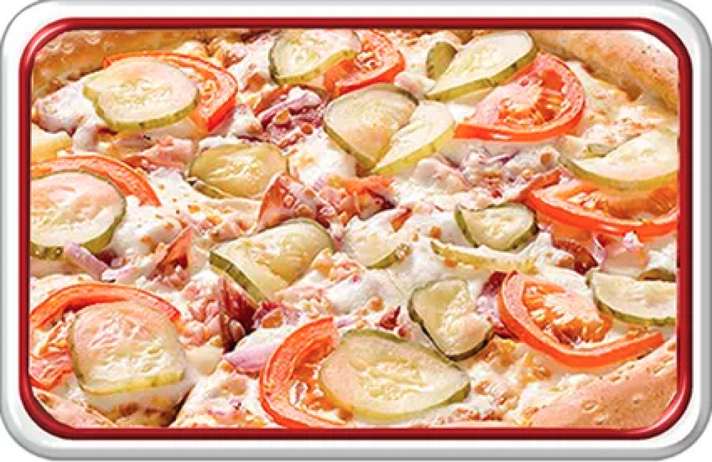 Сырный соус, говядина, бекон, соленые огурцы, томаты, красный лук, моцарелла