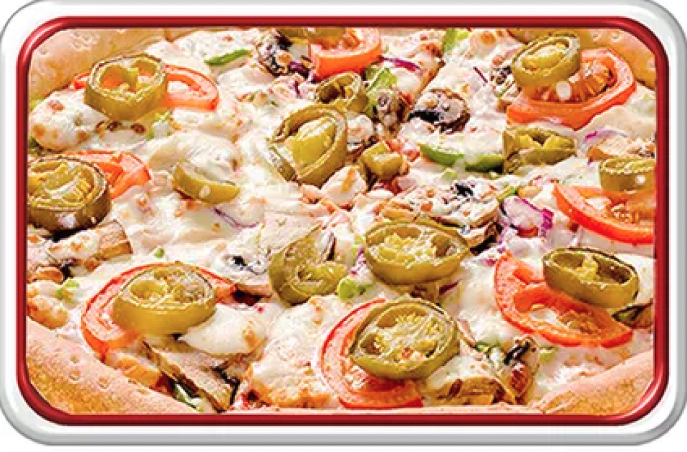 Итальянский соус со специями, перчик халапеньо, сладкий перчик, цыпленок, томаты, шампиньоны, лук, моцарелла