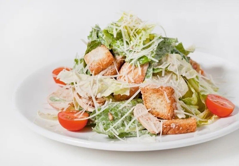 Салат айсберг, куриная грудка, соус «Цезарь», томаты черри, чесночные гренки, сыр «Пармезан».