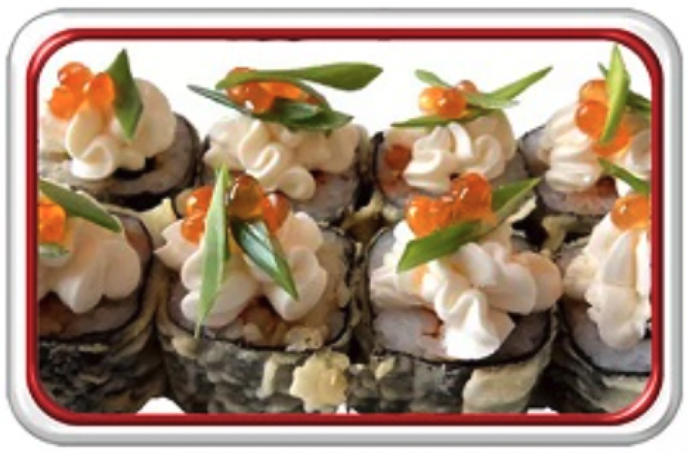 Снежный краб, майонез, сливочный сыр, зеленый лук, огурцы, красная икра, рис