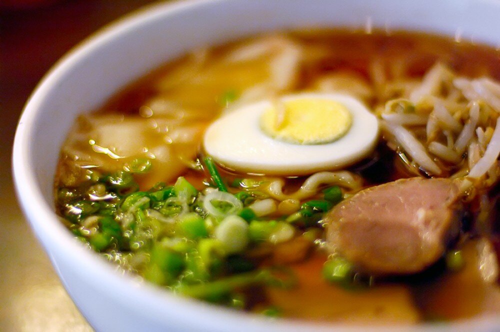 Наваристый острый бульон с говядиной, лапшой, яйцом и грибами.