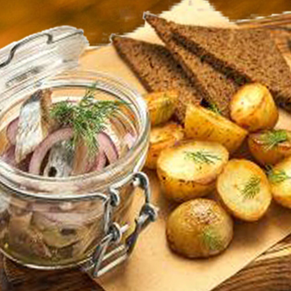 Филе сельди с лучком, картошкой и чесночными гренками.