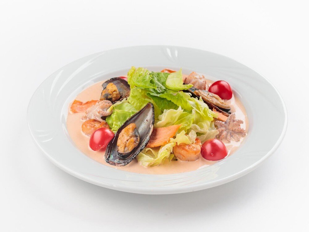 Микс салат, черри, мидии, креветки, кальмар, осьминог, сливочный соус.